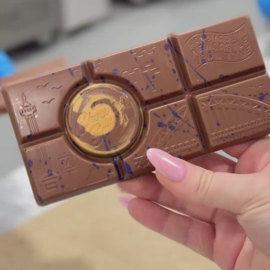 This milk chocolate bar is filled with an almond caramel and toasted almond nougat. Decorated beautifully with gold cocoa and purple cocoa butter!