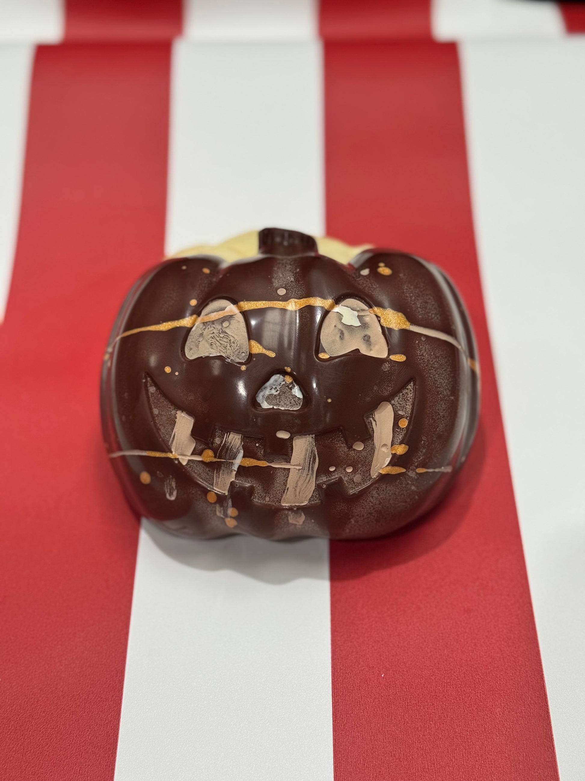 Our amazing team created this Trick or Treat Pumpkin. It's a super fun and delicious way to enjoy some great chocolate this spooky season. The treat half has a shell of dark-milk and is filled with a double chocolate caramel, a cookies and cream marshmallow fluff (veggie friendly) and crunchy cookies and cream sandwich biscuits.